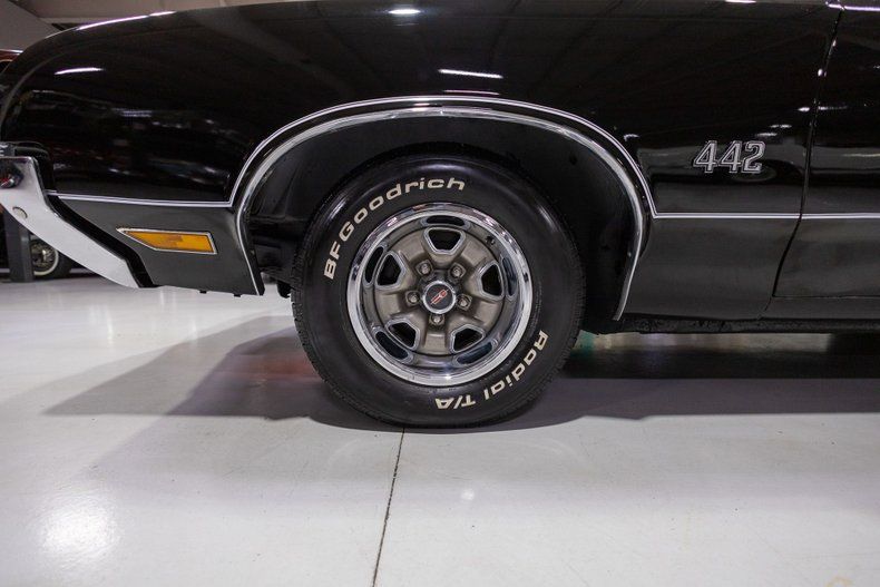 This 1970 Oldsmobile 442 Convertible is a triple black muscle car convertible with great options and desirable documentation! Many would consider 1964 as the kick-off year for an entirely new category in the car market; that being, the muscle car. The first so-called muscle car came into being as an option package by Oldsmobile's GM sister brand, Pontiac, when it released the performance-oriented GTO package on its mid-size car and placed the large Pontiac 389 cubic inch V8 into it. Although Pontiac kicked-off the muscle car race, Oldsmobile was not far behind when, in mid-1964, it debuted its own performance-oriented package, the "4-4-2." The "442" package was essentially a repackaged version of its lesser-known "Police Pursuit" package, and consisted of (and stood for) a 4 barrel carburetor, 4 on the floor 4 speed manual transmission, and 2 (dual) exhausts, along with a beefy V8 and heavier duty suspension and cooling components. As the years progressed through the late-60s into 1970, the Oldsmobile 442 had underwent several major body style changes as did the initial "4 barrel, 4 speed, 2 exhaust" nomenclature with the introduction of automatic transmissions. The 442 was also no-longer merely an option package but had been spun off into its own distinct model line during the muscle car era. Perhaps most noteworthy about the 1970 Olds 442s is the fact that they are considered by some as Oldsmobile's last true muscle cars since their 455 cubic inch Olds V8s were not hampered by the pollution control regulations that detracted from the cars' performance from 1971 and beyond. In addition to the massive Olds big block engine, the '70 442 also came outfitted with other performance-oriented features such as heavier duty suspensions and impressive exhaust systems, along with special 442 appearance items such as unique interiors and identifiable exterior trim. All of the 1970 4-4-2 were 2 doors that came in three body styles, the common Holiday Hardtop, the rare Sports Coupe, and the most luxurious and most expensive Convertible. In total, Oldsmobile produced less than 3,000 1970 442 Convertible which makes this particular example a very rare and desirable automobile. Additionally, this particular 442 Convertible is a well-documented example, coming to us with its protect-o-plate and build sheets. Powering this '70 Olds 442 is a 455 Cubic Inch V8 engine fed by an upgraded Edelbrock single 4 barrel carburetor mounted atop an Offenhauser intake manifold. The 455 V8 is backed by a Hydra-Matic automatic transmission that ensures that just about anybody can take this muscle car for a spin around the block. Exhaust exits the Olds big block via a dual exhaust setup that generates a terrific throaty sound out the rear trumpet-style tailpipes. Being that Oldsmobiles were considered more deluxe cars, they generally came (like this one) with many fantastic options! With power steering, maneuvering in and out of a tight parking space at the local ice cream parlor or car show is almost effortless. Power front disc brakes and power drums in the rear help ensure that you'll be able to bring this 442 to a complete stop much easier. The black vinyl power convertible top is in wonderful condition and it goes up and down with the simple flick of a switch. Riding on a set raised letter BFGoodrich Radial T/A tires mounted on Super Stock II rims, this 1970 Olds 442 has an imposing muscle car look and fantastic ride cruising down the road. The body of this 442 Convertible has been correctly refinished in beautiful Ebony Black paint, accented with white decals on the W25 hood's scoops, completing the exterior look of the car. The interior of this 1970 Oldsmobile 442 Convertible screams luxury! The front Strato-Bucket seats and rear bench have been reupholstered in black vinyl. The center console, matching door panels, black carpeting, padded dash with burl grain inserts, and special Custom-Sport 4-spoke steering wheel are in great shape and retain a nice stock appearance. The instrument cluster is equipped with a 120 MPH speedometer, fuel gauge, and clock, along with indicator lights for the emergency brake, generator, oil pressure, and engine temperature. The dash is finished with an AM/FM push button radio in the center and a locking glove box on the passenger side. Whether you're buying your first classic muscle car or you're adding to your existing collection, this 1970 Oldsmobile 442 Convertible would make a wonderful choice. Give Ellingson's a call today at 763-428-7337!
